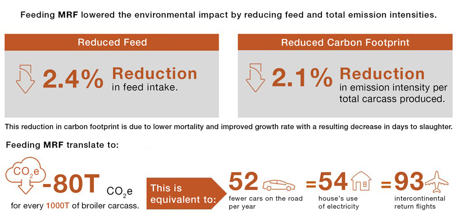 The LCA then showed that the supplementation of MRF can enhance broiler performance, improve profitability, reduce carbon footprint, and meet sustainability goals. With correct supplementation, more cost-effective, environmentally sustainable feeds can be produced, resulting in a greater return on investment and a lower carbon footprint.