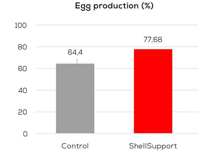 According to the results of the 56-day trial conducted on 64-week-old commercial laying hens under heat stress, the differences between group averages were found to be statistically significant in terms of the effect of Shell Support supplementation with equimolar concentration on egg production. In terms of egg production, the highest value was recorded in the group with ShellSupport supplementation with 77.68% and the lowest value in the control group with 64.40%.