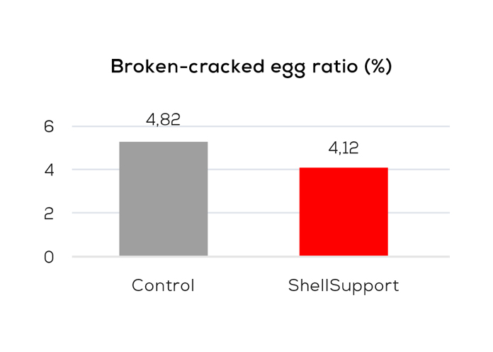 As for the rate of broken cracked eggs, the highest value of 4.82% was observed in the control group. The group with Shell Support achieved 4.12% better results than the control group.