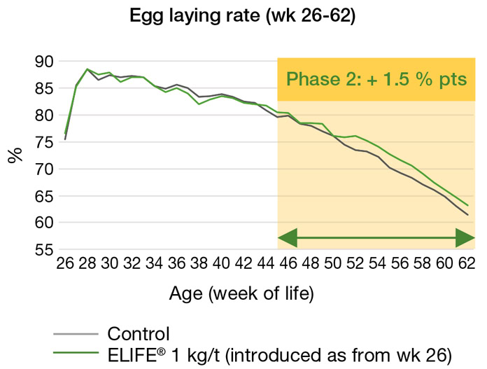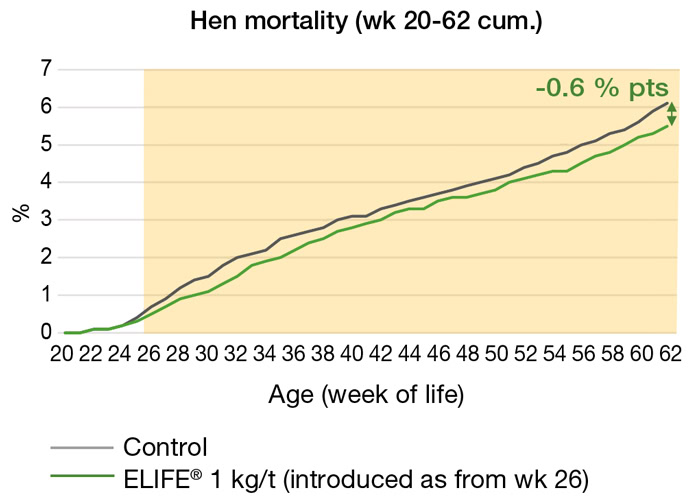 Both treatment groups showed an equally low hen mortality at housing of the birds (into the laying unit) up to the onset of the antioxidant supplementation (i.e. week 20 till 26 of life). However, throughout the subsequent trial period (37 weeks long), the ELIFE® group demonstrated a consistently higher hen survival (Figure 2). At the end of production, this treated flock had a cumulative 20–62-week mortality rate of only 5.5% vs. 6.1% for control (Table 1).