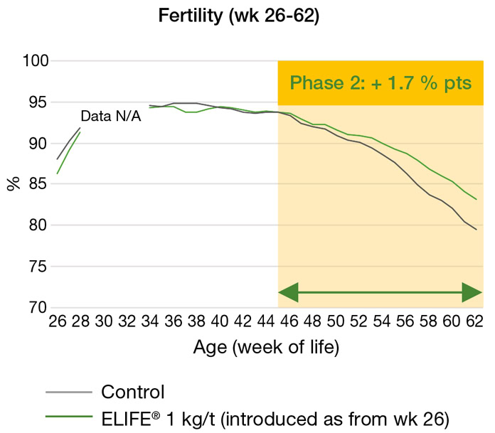 Additionally, the fraction of fertile hatching eggs (from this 2nd laying phase) from which embryos successfully hatched was 0.6 percentage points higher for the antioxidant treated group (despite being already very high for the control). In other words, this indicated a better ‘fertile hatchability’ for the ELIFE® supplemented group (Table 1). Therefore, next to the degree of fertile and viable hatching eggs (detected on incubation day 18), also embryonic strength/quality seemed favored as from week 45 of life when adding the phytogenic blend to the parental diet.