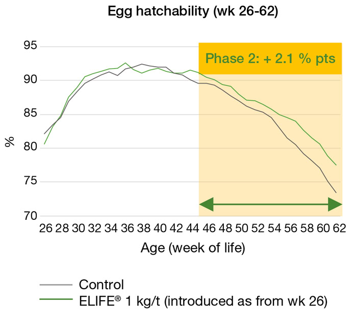 Next to egg production, also fertility rate (i.e. via automatic candling at incubation day 18 in the hatchery) of the hatching eggs collected during Phase 2 of lay was higher for the antioxidant treated group (Figure 3). On average, ELIFE® dietary supplementation during this later period increased the fraction of fertile and viable eggs by 1.7 percentage points (Table 1). In line with fertility, also hatchability of the eggs derived from this production phase was higher for the antioxidant supplemented breeders (Figure 4). During this critical end period, ELIFE® on-top addition to the parent stock’s diet raised the hatching rate by more than 2 percentage points on average (Table 1). Nevertheless, all fertility and hatching results were originally similar for both groups at the onset of the supplementation.