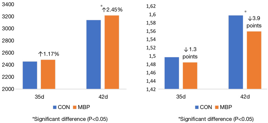 Body weight and feed conversion ratio of the birds fed basal diet with or without Dia-V™ MBPRO are shown in Figure 1 and 2. Overall, Dia-V™ MBPRO supported improved performance in broilers. Dia-V™ MBPRO fed birds had numerically (P>0.05) better body weight and feed conversion ratio at 35d. By 42d, the birds receiving Dia-V™ MBPRO had higher (P<0.05) magnitude of benefits in performance resulting in a significant improvement in body weight (2.45%) and feed conversion ratio (3.9 points) compared to control birds. In addition to that, there was numerical (P=0.1038) improvement in breast meat yield in Dia-V™ MBPRO (31.43%) birds compared to control (31.10%).