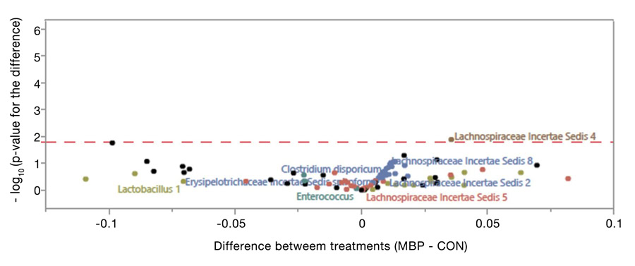 Footnote: In the above graph, positive values on x-axis indicate higher abundance of that bacteria in MBP group and negative values on x-axis indicate lower abundance in MBP group compared to CON group. When the corresponding y-axis values get above the red dotted line, the MBP-CON difference is statistically significant (significance cut-off or threshold).