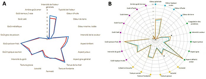 Expertly trained taste testers have evaluated salmon/trout fillets in comparative trials. Across ~20 pre-determined parameters evaluating taste, smell, texture and appearance they have seen no significant difference between traditionally-fed salmonids and insect-fed salmon and trouts with the exception of a more intense coloration of the flesh and improved juiciness (Fig 1.)