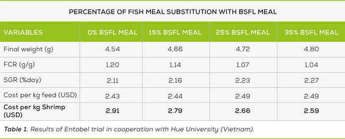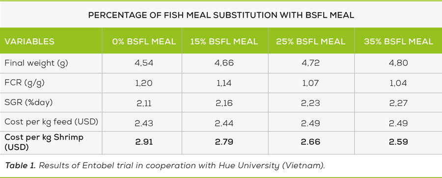 A trial in cooperation with Hue University (Vietnam) tested different shrimp feed diets with increasing substitution of fishmeal by BSFL meal. The results showed that the final weight, the FCR, and the Specific Growth Rate improved with an increasing BSFL meal inclusion in the diet. The best results were achieved with a 35% fishmeal substitution by Entobel’s BSFL meal. While with the current pricing of BSFL meal, the feed cost was slightly higher, the cost per kg of shrimp produced was significantly lower (Table 1).