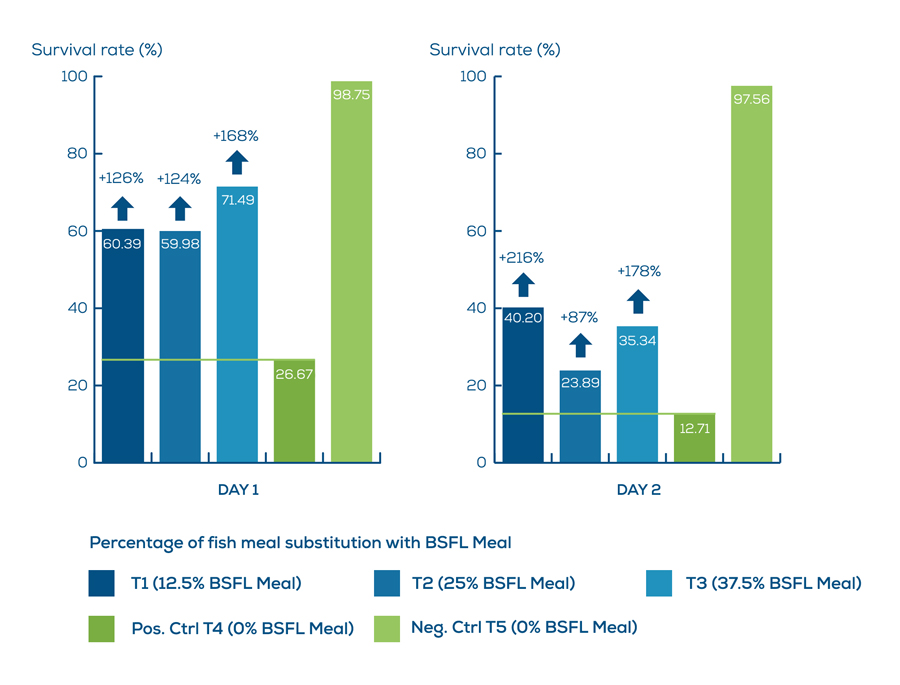 The Vibrio challenge test was performed in cooperation with ShrimpVet. In a commercial shrimp diet, BSFL meal substituted fish meal by increasing percentages. After 43 days, Vibrio parahaemolyticus was introduced and the survival rate was measured for the different diets, after day 1 and day 2 (Figure 1). The diets that included BSFL meal, showed a significant increase in survival, showing the positive immune effects of BSFL meal in shrimp diets.