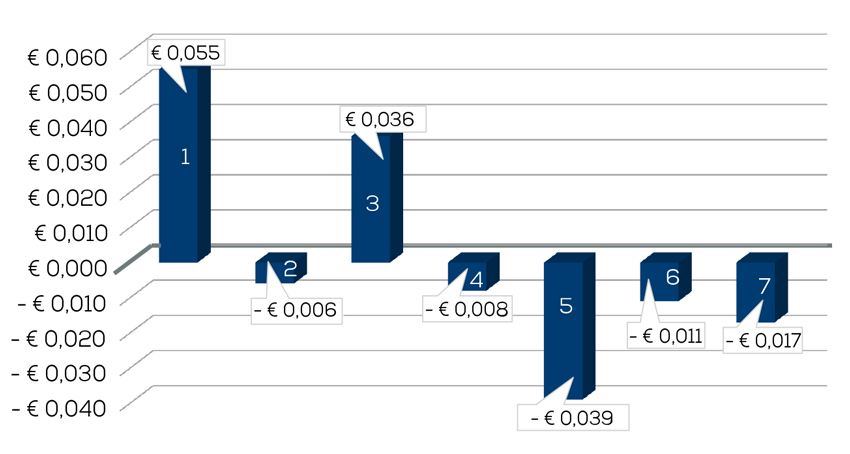 Researchers sought to compare the cost of the feed additive treatment to the benefit in terms of value per bird. Zootechnical results from this study were analyzed. The additional value was highest for birds receiving the Presan-FY product, with an additional value of €0.055 per bird (Figure 2). Considering other options, only one other product delivered a positive value per broiler, meaning that the improvement in performance compensated for the cost of adding the feed additive solution. So, as we consider the findings of this large study, we see that the Presan-FY product was interesting from an economic as well as zootechnical performance perspective.