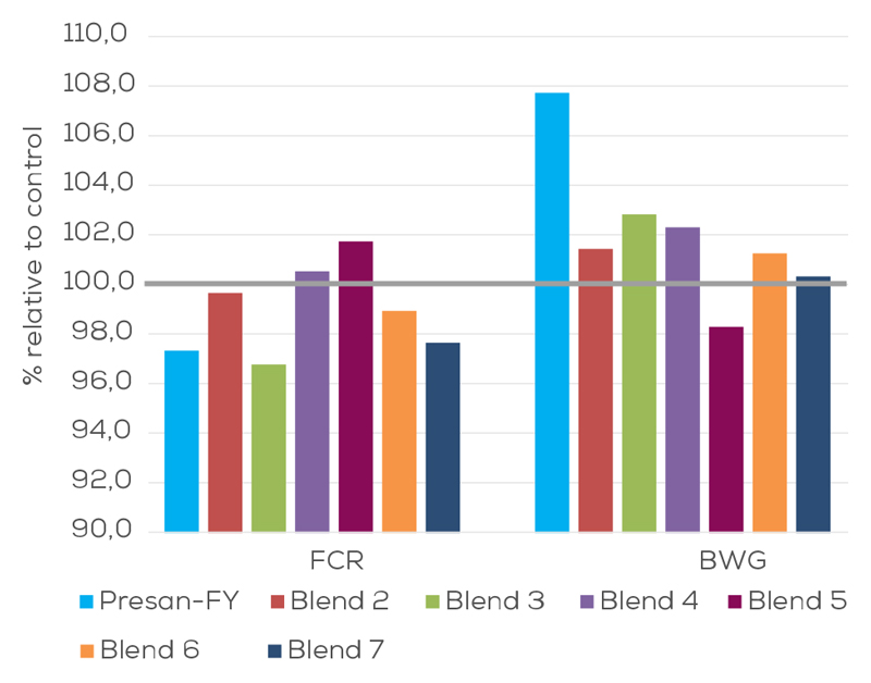 Looking at the growing cycle, the birds receiving the Presan-FY blend showed significantly higher body weight gain compared to the control group (+7.8%) and all the other blends (+6.6% average) (Figure 1). The birds receiving Presan-FY also had a lower FCR compared to the control group (-2.2%), with Presan-FY improving the FCR by 2% on average compared to all the other treatments.