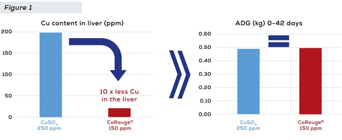 A recent study conducted in Thailand (at the BARC research station) has shown that piglets fed 150ppm of Cu (from monovalent copper) had a liver content accumulation divided by 10 times compared to a group fed 250ppm of Cu sulfates. Nevertheless, performance parameters of both groups (FI, FCR, ADG…) were strictly similar, demonstrating that liver Cu accumulation is not a relevant biomarker to predict potential growth performance improvements (see figure 1).
