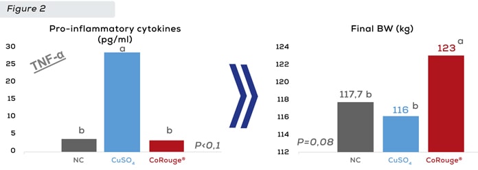 The University of Illinois in collaboration with Animine French company studied the impact of Cu toxicity on long term performance. Feeding 250ppm of sulfates (vs. 250ppm of monovalent copper) all along the feeding phases led to the generation of hepatic oxidative stress markers such as malondialdehyde (MDA) and to the secretion of anti-inflammatory cytokines (TNFα and IL-β, see figure 2) in blood at 63 days of age. As a result the supranutritional dose of sulfates negatively impacted performance at the end of the trial compared to the monovalent form that less accumulated in liver.