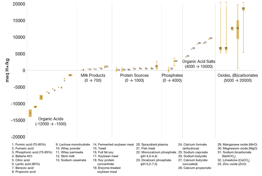 In buffered organic acids and salts of organic acids (e.g., calcium propionate), part or all of the acidification power has been removed. These types of raw materials may be equivalent to the organic acids themselves in terms of organic anion sources (e.g., lactic acid and calcium lactate are both sources of lactate) but from an ABC-4 perspective, they are completely opposite. Fully neutralized salts of organic acids do not acidify at all. On the contrary, they actually increase the pH as can be seen from their positive ABC-4 value (4000 to 10000 meq/kg).