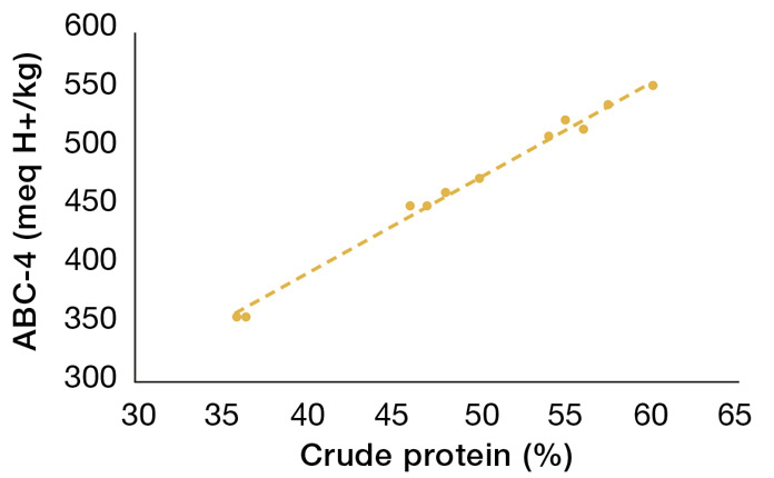 Protein sources are the macro-ingredients that potentially have the largest impact on the ABC-4 value of a feed. Their higher ABC-4 values (0 to 1000, most commonly 400 to 600 meq/kg) compared to starch and fiber sources, are explained by the higher buffering capacity of peptides due to the presence of free amine groups (lysine, arginine and histidine) and free carboxylic groups (glutamic and aspartic acid). Raw materials containing the same protein type (e.g., soy protein) have higher ABC-4 values as the protein content increases (Figure 2). Different protein types (soy, potato, wheat gluten, …) with the same crude protein content have different ABC-4 values due to their different amino acid and structural composition.