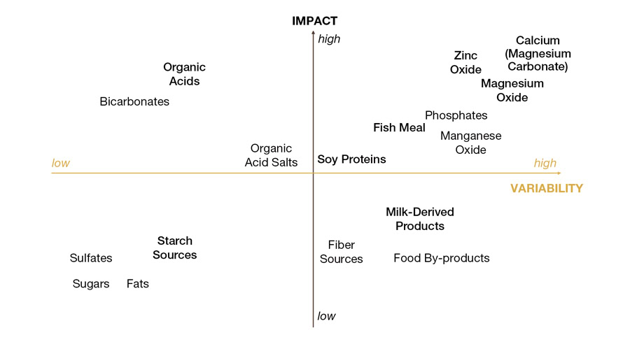 High inclusion levels make macro-ingredients nutritionally important, but from an ABC-4 perspective, some are less relevant because major nutrient classes like carbohydrates (starch, sugar) and fats have almost no buffering capacity. Proteins, minerals and fiber, however, do have an impact.