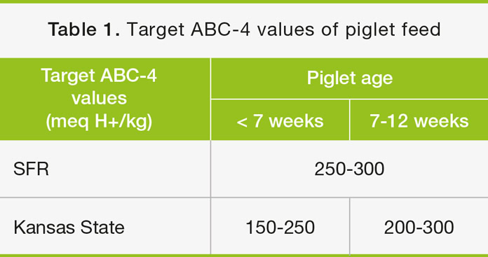 Limited gastric acid production is typical for young piglets, so ABC-4 values are most relevant in young animal nutrition. It is generally acknowledged that the gastric acid production by a piglet may remain insufficient (pH>3.5-4.0 in fasting state) until 6-7 weeks of age, and suboptimal (pH>2.5-3.0 in fasting state) until approximately 60 days (8-9 weeks). Research by F. Molist et al. of Schothorst Feed Research (SFR, NL) and Stas et al. of Kansas State University establishes target ABC-4 values of a complete feed as a function of the animal’s age (Table 1).