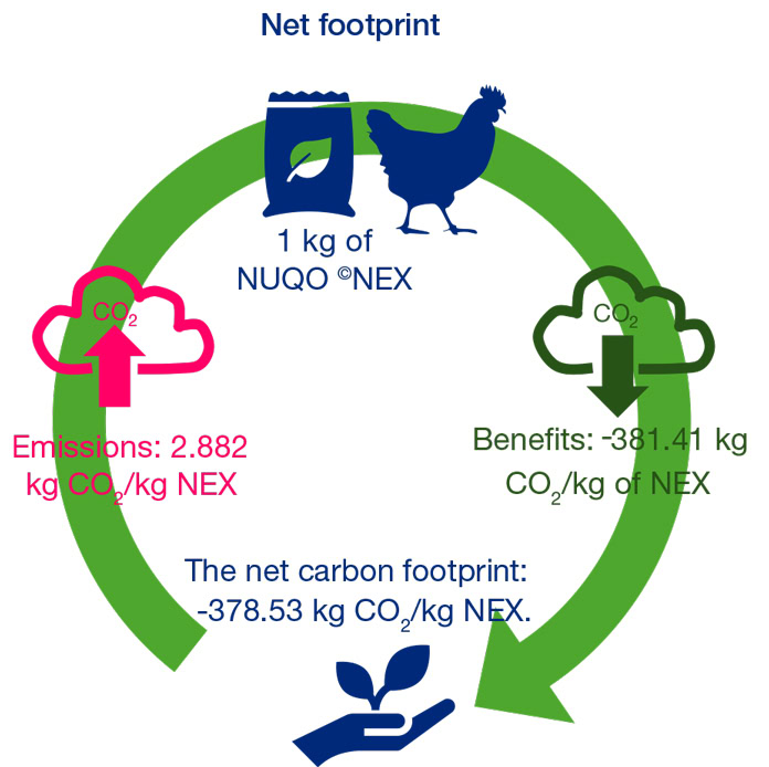 In the application phase, NUQO©NEX demonstrated its efficacy in reducing the feed conversion ratio, resulting in a corresponding reduction in the carbon footprint of poultry meat production. By extrapolating data from trials conducted at the University of Arkansas, which exhibited a conservative feed conversion ratio reduction of -1.39%, NUQO©NEX was estimated to substantially reduce the carbon footprint of poultry meat. This translates to a substantial reduction in emissions for every kilogram of meat produced with NUQO©NEX. In other words, the net carbon footprint of NUQO©NEX is -378.53 kg CO2/kg product. This represents 135 times what it takes to produce it, if we consider a ‘Green ROI’ (ie = 1 kg CO2 eq. spent using NUQO©NEX will result in savings of 135 kg CO2 eq. meat production).