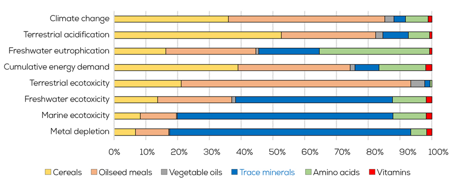 Even if trace minerals represented only 0.78% of total feed ingredients consumed in Europe, they showed the highest contribution to freshwater and marine ecotoxicity, due to their high toxicity potential when emitted into soils and waters, and to metal depletion, due to the fact that they are non-renewable resources. This high contribution demonstrates the importance of the sustainable use of trace minerals in terms of source and dose used in animal nutrition.