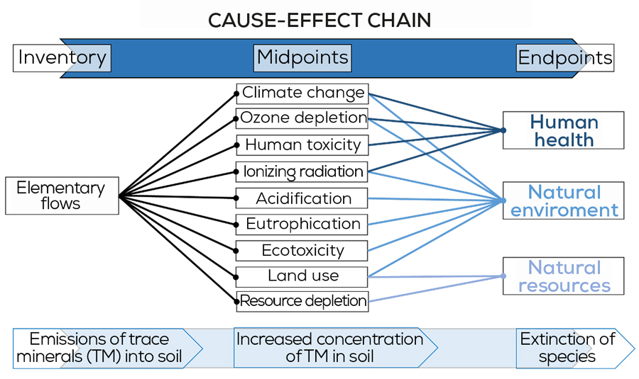 As required by ISO 14040, four phases are involved in an LCA study and they include: (i) goal and scope definition, (ii) inventory analysis, (iii) impact assessment, and (iv) interpretation. The results of an LCA study can be calculated using different impact assessment methods, which give different detail levels of the cause-effect chain. Considering the cause-effect chain for a trace mineral, a midpoint method looks at a point in the cause-effect chain, i.e., the increased concentration of trace minerals in soil, while an endpoint method looks at environmental impact at the end of this cause-effect chain, i.e., the extinction of species due to the emission of such a mineral (Figure 1).