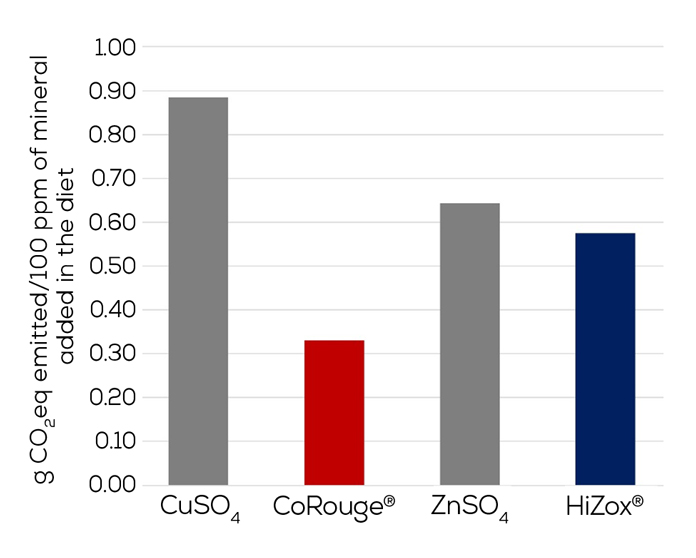 The recent LCA performed by Animine for its trace mineral sources showed that the carbon footprint (g CO2-eq/100 ppm of mineral provided in the diet) of HiZox® and CoRouge® are much lower than the standard sulfate sources (Figure 3). The same was showed for water quality impact categories (freshwater ecotoxicity, freshwater eutrophication, marine eutrophication). The reasons for this lower impact are the high metal concentration of HiZox® and CoRouge® combined with their low levels of contaminants (e.g., heavy metals).