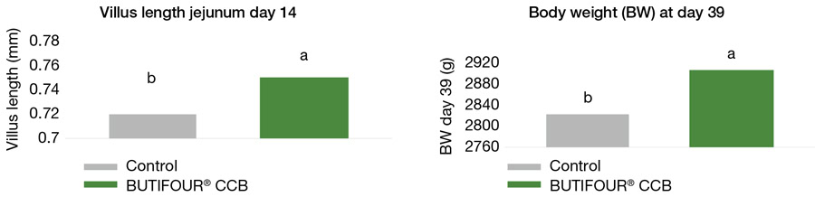 Butyrate is naturally present in the hindgut of broilers by bacterial fermentation, but for intestinal development and gut integrity it should be administered via feed to target the small intestinal part from duodenum up until ileum. Usually, butyric acid is supplemented as fat coated salts of butyric acid at a dosage of roughly 500 – 1500 g/T in poultry diets depending on age, species and farm conditions. An experimental trial with 720 Ross® 308 broilers showed that supplementing 1500-1000-500 g/T BUTIFOUR® CCB in broiler diets increased villus length and eventually final body weight significantly.