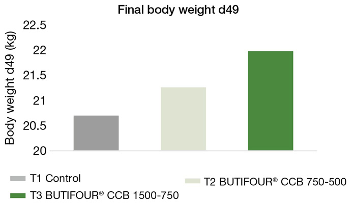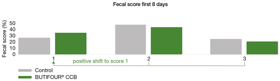 In conclusion, the use of a butyrate source in starter diets is common. Moreover, butyrate can be combined with other short or medium chain fatty acids for total antibacterial protection. The advised dosage is 750 -500 g/T for piglet starter diets or double the dosage depending on the farm conditions. A trial in an experimental farm in Belgium showed a dose response on body weight at day 49 of age, when piglets were supplemented with 750-500 g/T or 1500-1000 g/T BUTIFOUR® CCB. Another trial with weaned piglets showed an improvement of the fecal score indicating less weaning diarrhea problems. Weaning diarrhea often starts from a (protein) digestive problem, hence this explains why butyrate improves the incidence of weaning diarrhea by improving gut integrity, nutrient efficiency and by reducing gut inflammation.