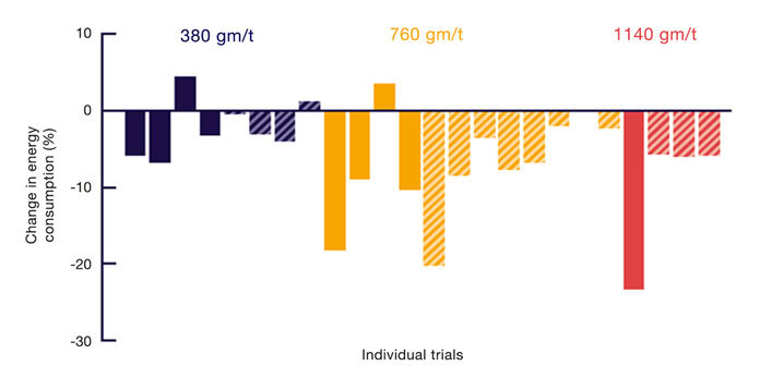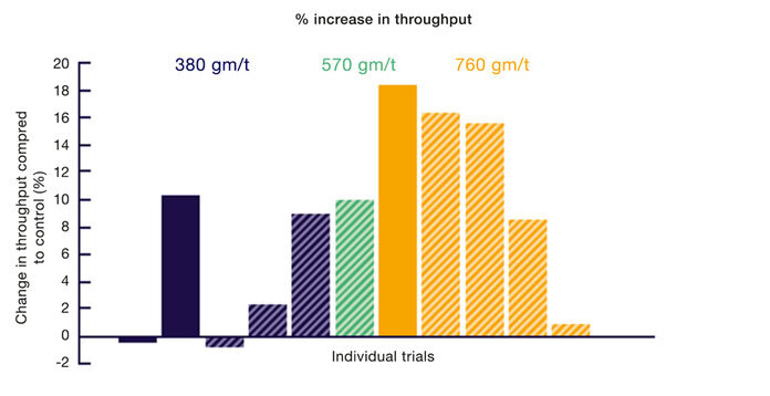 Glycerol esters of propionic acid and surfactants have given consistent results in terms of reducing energy usage and/or increasing the throughput as you can see from graph 4 and 5 below. In doing so, operational costs are reduced, improving the profitability of the mills implementing SmartMoisture®.