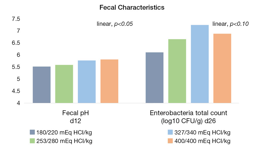 Fecal indicators highlighted the impact of high-buffering diets on gut health. During Phase 2, higher ABC-4 values increased fecal looseness and diarrhea frequency, with piglets on 400 mEq HCl/kg diets showing the highest incidence of diarrhea. While fecal dry matter was not consistently affected, increasing ABC-4 led to a linear increase in fecal pH (Figure 4). Higher fecal pH suggests reduced fermentation activity in the hindgut and can be an indirect measure of volatile fatty acid (VFA) concentration, where higher pH might indicate lower VFA production and inhibition of growth of pathogenic bacteria. By day 26, a linear tendency (P < 0.10) was observed for total enterobacteria counts, suggesting that higher ABC-4 levels may predispose to increased bacterial load. Although not statistically significant, this trend supports the observed increase in fecal pH and diarrhea frequency at 400 mEq HCl/kg, suggesting a potential destabilizing effect on gut microbiota at excessive buffering levels.