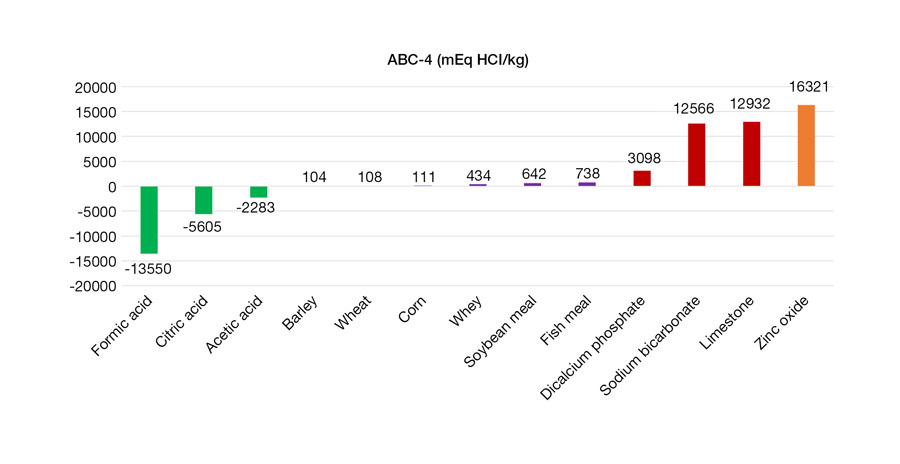 Ingredients vary widely in ABC-4 values (Figure 1). Protein-rich meals (soybean, rapeseed, fish) and mineral sources (calcium, sodium, zinc) tend to have high ABC, absorbing large amounts of gastric acid and weakening the stomach’s natural defense. In contrast, organic acids exhibit a negative acid-binding value and can offset the adverse effects of high ABC ingredients. Among mineral additives, ZnO is particularly notable, with one of the highest reported ABC-4 values (16,321 mEq HCl/kg). Consequently, inclusion of ZnO at pharmacological levels or the use of certain calcium sources can sharply increase the acid-binding capacity of the diet.
