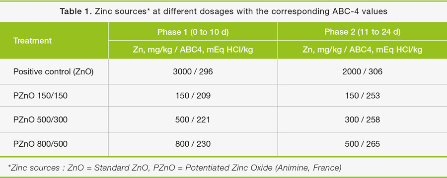 A potentiated zinc oxide source (PZnO, Animine, France), supported by over 30 globally published papers, possesses unique physicochemical properties such as intermediate density, large particle size, and high specific surface area. These features enhance antibacterial activity and bioavailability, making it effective at much lower inclusion levels compared with standard ZnO doses of 3–4 kg/ton of feed. Building on this, KSU conducted a 24-day study in which low ABC-4 diets were combined with increasing doses of PZnO (Table 1), as a potential alternative to pharmacological levels of ZnO. The study aimed to evaluate the effect of these diets on the production performance and fecal consistency of weanling piglets.