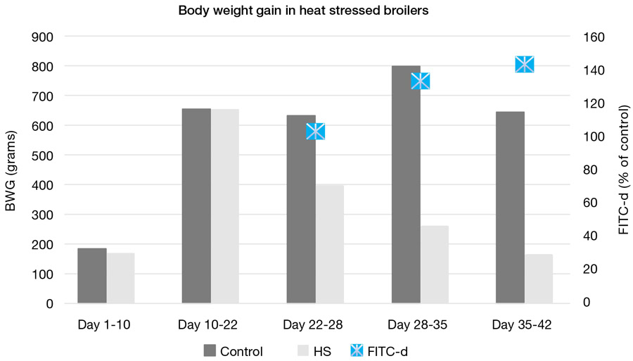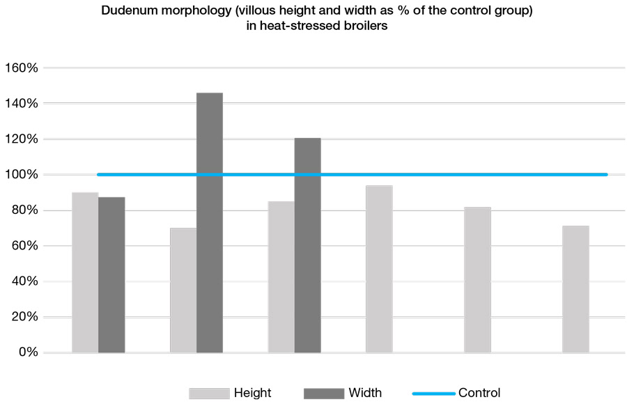 Heat stress in poultry production is a common reality; its effects are quite complex and harmful and depend on the intensity and duration of the exposure to high temperatures. The gut is affected by heat stress through several pathways, including organ ischemia and hypoxia, as well as oxidative stress. In heat stress challenges, the intestinal barrier is compromised because of lower tight junction protein expression, enterocyte damage, and microbiome unbalance, leading to gut health issues such as dysbiosis and necrotic enteritis.