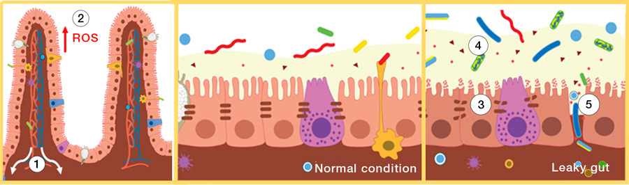 In the gastrointestinal tract, oxidative stress and the consequent tissue damage lead to increased intestinal permeability. This facilitates the translocation of toxins and pathogens from the intestinal tract into the bloodstream (Figure 3).