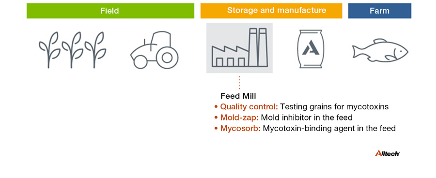 Fortunately, some preventive and corrective steps can be implemented at this stage to mitigate the risk of exposing fish and shrimp to mycotoxins. In fact, mycotoxin prevention and mitigation strategies along the aquafeed supply chain are primarily implemented at the feed mill level (Figure 1). The implementation of a monitoring plan at feed mills, which screen feedstuffs upon arrival, is an effective option for preventing mycotoxin contamination.
