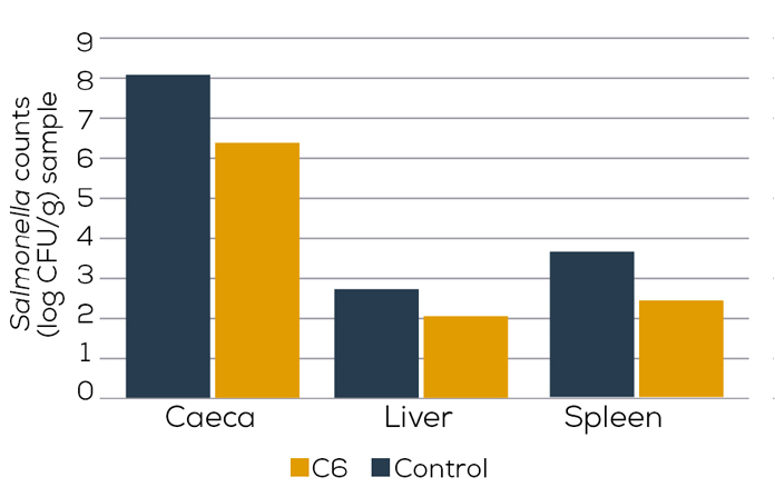 As such, fatty acids may already lower gut colonization and translocation to organs at very low concentrations, as documented for caproic acid (C6) (Figure 3). The amount of Salmonella-positive birds was significantly (P=0.008) reduced by adding C6 to the diet at 3 kg/mT, as evidenced by a reduction in positive cloacal swabs taken one day after 5-day-old hens were inoculated with Salmonella Enteritidis. Three days after inoculation, cecal colonization was significantly (P=0.005) reduced, as was translocation to the liver (P=0.043), while there was also a trend (P=0.060) towards lower splenic counts in the C6-treated group.