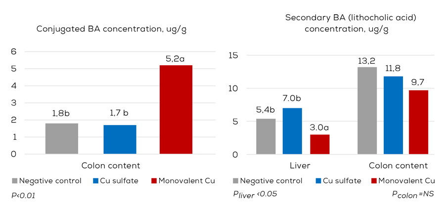 One of possible explanations for this huge effect on performance is the effect of Cu on BSH activity. Indeed, this trial showed that pigs fed monovalent Cu had higher concentration of conjugated BA in the intestine (showing a lower deamination activity of BSH) than Cu sulfate group. Monovalent Cu group also presented significatively lower concentrations of secondary BA in liver and numerically (-18%) in colon content.