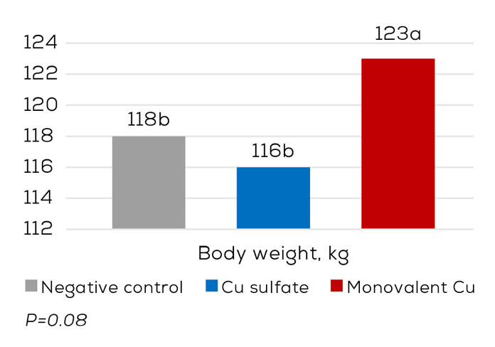 A recent study conducted by Animine in the USA (at the University of Illinois) has shown that growing pigs fed 250ppm of Cu (from monovalent copper) had a higher body weight compared to a group fed 250ppm of Cu sulfate (divalent copper).