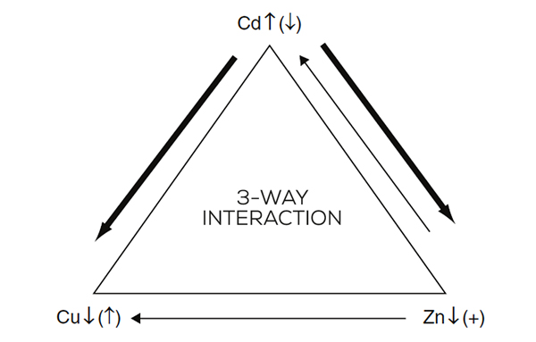 Mutual antagonisms between copper, cadmium and zinc lead to complex three-way interactions. Raising the level of one interactant can lower the status of the other two, as shown for Cd.