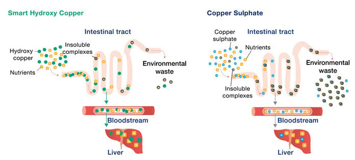 Solubility affects how minerals interact with other nutrients in feed. Since feed generally consists of around 88% dry matter and 12% moisture, products with high solubility will already interact with other nutrients in the feed. Figure 2 shows the differences between hydroxy copper and copper sulphate, where copper sulphate has high solubility, and will cause formation of insoluble complexes that will be excreted as environmental waste to a high extent. Hydroxy trace minerals have a slow release, therefore allowing for at the right time, at the right place, the trace element to be taken up by transporters in the small intestine with less competition for transporters at the beginning of the small intestine and optimal absorption. This reduces the excretion of environmental waste, reducing eutrophication and contributing to environmental sustainability.