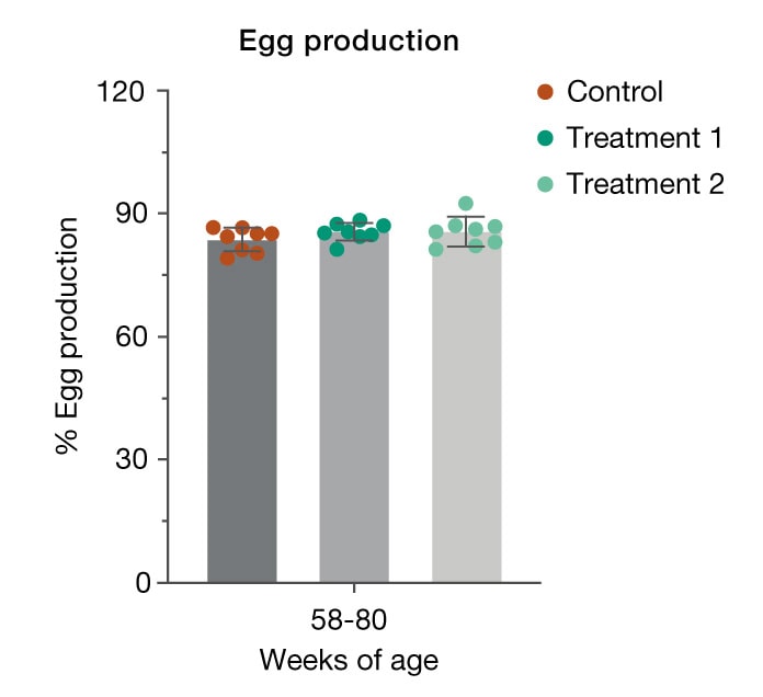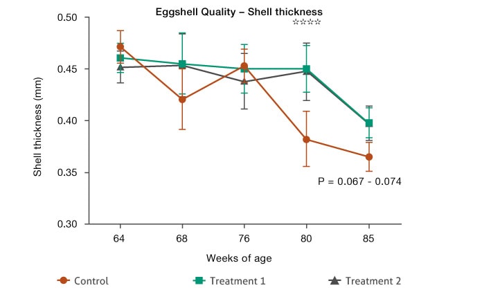 In both treatment groups, shell thickness was maintained relatively throughout the trial, while dropped notably in the control birds at 80 weeks of age. Concurrently, supplementation of both concentrations of activated vitamin D3 maintained eggshell thickness compared to the control diet, indicating that activated vitamin D3 may counteract the decrease of shell thickness frequently observed as hens age, because it ensures the calcium absorption and transport to the eggshell. Significant improvements in relative shell weight and thickness indicate that supplementing activated vitamin D3 in older laying hens may benefit eggshell quality. Additionally, a numerical increase of laying performance indicates that the overall productivity is maintained compared to the control group. This finding shows that Active D is a promising tool for egg producers to achieve the goal of 100 weeks and 500 eggs and thus enables longer economic production.