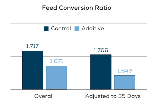 Overall feed conversion was 1.717 for the control birds and 1.671 for the birds fed the additive; an advantage for birds fed the additive of 4.6 points (Figure 1).