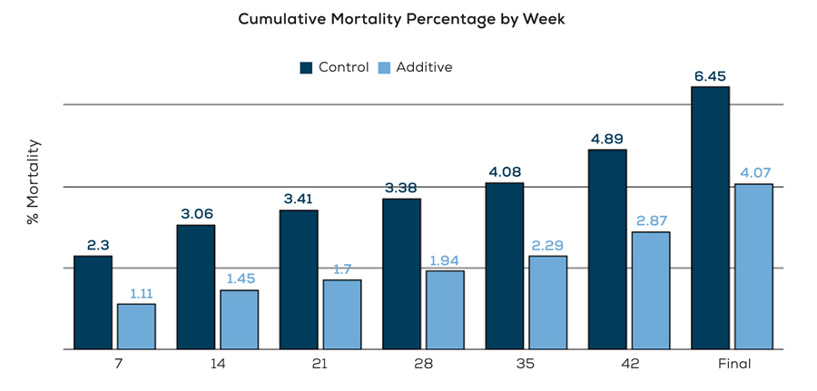 Weekly mortality, cumulative mortality, and transport mortality were all lower when birds were fed the additive compared to those fed the antibiotic (Figure 2).Because weight gain was maintained when compared to the standard diet and replacing the antibiotic and binder showed improvements in feed efficiency and morality there was also an economic improvement to the producer when the additive was used. This commercial study shows that feeding the additive with multiple modes-of-action can improve efficiencies and performance, which are critical to increasing profits. In this case, the added annual profit for a producer processing 1 million birds per week would equate to approximately USD 6 million. Using an estimated price for the control diet of USD 375 and USD 380 for the additive diet, the return on the cost of the additive vs the antibiotic control diet is approximately 4 to 1.