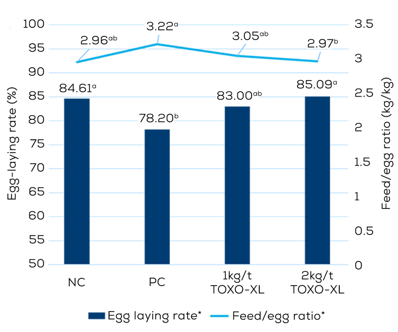 – 1.0 kg/t TOXO-XL increased egg-laying rate by +4.80% and reduced FCR by -0.17 (vs. PC)