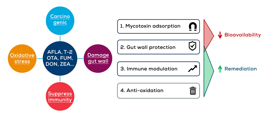 4. Various microbes and enzymes are also added to the feed to break down some of the mycotoxins into less toxic metabolites in the gastrointestinal tract (GIT). Despite some stability issues, such technologies support the concept of “beyond binding”.