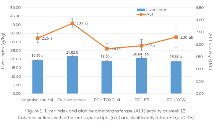 TOXO-XL has been validated through various established in vivo models, with the collaboration between Trouw Nutrition and independent scientific partners. Most recently, a trial was conducted at Department of Animal Nutrition and Feed Science, College of Animal Science and Technology, Huazhong Agricultural University (Wuhan, Hubei, China). In this trial, 26-week-old Roman laying hens were enrolled and randomly allocated into five experimental groups. Each group contained ten replicates of nine birds. The experimental groups received a basal diet (Negative control/NC), a NC diet supplemented with the combination of 0.15 mg/kg AFB1, 1.50 mg/kg DON and 0.12 mg/kg OTA (Positive control/PC), a PC diet with the inclusion of 1.0 kg/t TOXO-XL (PC + TOXO-XL), a PC diet with the inclusion of 1.0 kg/t enzyme biotransformation-based product (PC + EB) and a PC diet with the inclusion of 1.0 kg/t yeast cell wall-based product (PC + YCW), respectively. The animal experiment lasted 12 weeks. At week 12, ten birds from each group were slaughtered to harvest liver organs and serum samples.