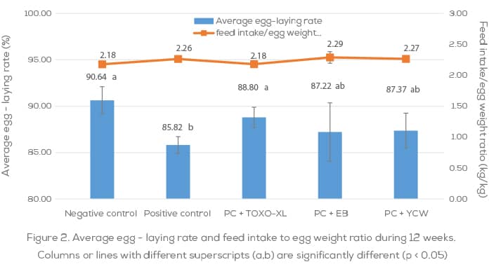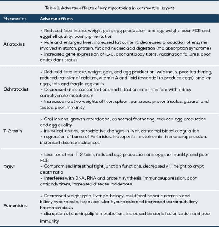 As Table 1 clearly shows, AF, OTA and T-2 can compromise bird performance while DON and fumonisins will have significant negative effects on gut integrity and immunity at the levels of toxins seen in commercial feeds. As a result, mere mycotoxin binding strategy may not help in protecting the birds and there is need for ingredients capable of improving immune and gut health. Additionally, poultry feed is usually contaminated with multiple mycotoxins and egg producers are looking for a broad-spectrum solution to safeguard their business.