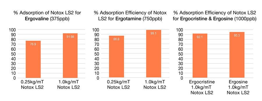 We conducted a literature review and developed equations to quantify their effects on animal performance. This helped us establish realistic, science-based risk thresholds for different species and ages. We also studied the physicochemical properties of ergot alkaloids, enabling us to define and apply the right technologies to bind and mitigate their negative effects. In vitro tests confirmed the effectiveness of our MHS Notox™ range of products, such as Notox™ LS, which is proven to bind over 90% of various ergot alkaloids at a moderate inclusion rate of 1 kg/mT (Figure 1).
