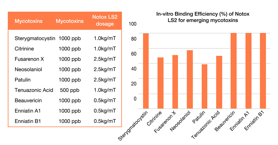 We also examined other emerging mycotoxins, including sterigmatocystin, citrinin, fusarenon X, neosolaniol, patulin, tenuazonic acid, beauvericin, and enniatins. In-vitro tests showed Notox™ products’ binding efficiencies ranging from about 60% to 100%, with an impressive average efficiency of over 80% (Figure 2). These tests further demonstrate Notox™ LS’ binding efficacy with a wide array of emerging mycotoxins. These findings show that Notox™ solutions can effectively support animals exposed to a broad range of mycotoxins, in addition to the six main mycotoxins.