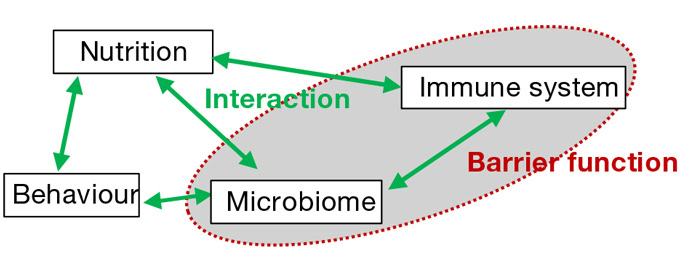 Phytogenics, also known as phytobiotics or botanicals, are a very heterogeneous group of substances of plant origin that are used for a wide variety of purposes in farm animals: To support the respiratory tract, for calming, as a natural flavouring, and many more. Essentially, they serve to increase the well-being of farm animals and thus their performance. In modern, animal welfare-oriented feeding concepts, special emphasis is given to support the microbiome. A strong interaction between nutrition, microbiome, behaviour and immune system of farm animals has been proven (Figure 1) and thus a holistic added value is achieved.