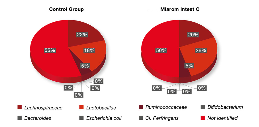 The trial was carried out in a flat deck with freshly weaned piglets (~28 days; 6.33 ± 0.75 kg) over 42 days. They were weighed on days 0, 14, 28 and 42 and the respective feed intake per pen was recorded for the periods in between. The faeces were scored three times a week using five categories from 1 – liquid to 5 – solid. On day 12, faecal samples were also collected from 8 animals each from the control group and the Miarom Intest C-High (MIC-H) group and directly preserved for subsequent analyses. In the faeces, the microbiome was analysed using quantitative real-time PCR for seven specific bacterial taxa and short-chain fatty acids using gas chromatography by Alimetrics (Alimetrics Group LTD, Finland).