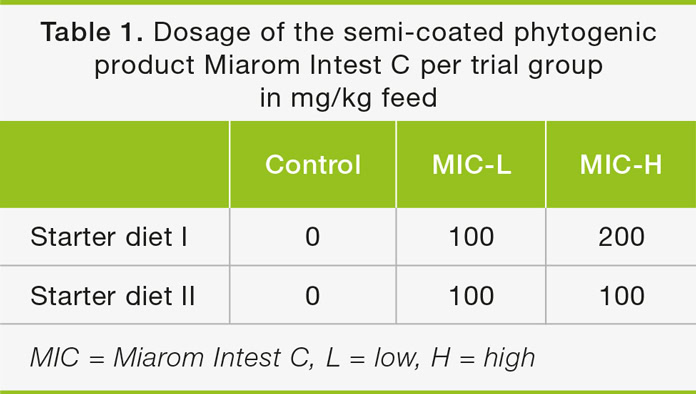 In a practical trial farm in southern Denmark, the effects of such a semi-coated product (Miarom Intest C, MIAVIT GmbH, Essen (Oldb.)) were tested in weaned piglets. Three groups of 108 piglets each (Danbred x Duroc) were divided evenly into 12 pens (replicates), each of which received a different on-top supplementation of the product. There was a control group, which received no product, and two experimental groups receiving the semi-coated product (Table 1).