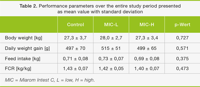 The performance parameters (Table 2) and the faecal scores between the respective groups showed no significant differences. The faecal scores of all groups were in the normal range between 3.2-3.4. The MIC-L group had the numerically highest values in relation to the performance parameters. However, the performance level of the experimental farm was already very high, so there was little potential to improve performance using a feed additive.